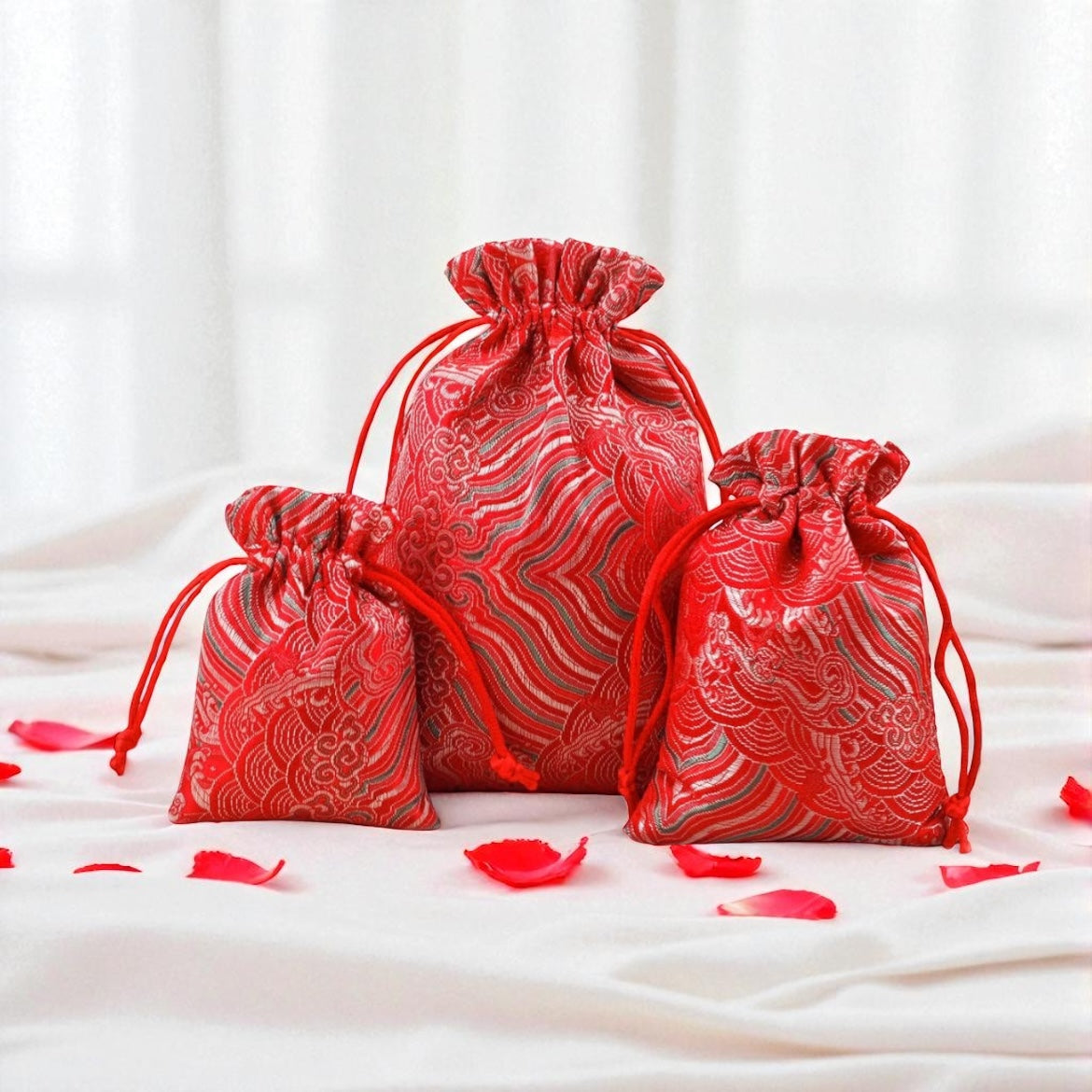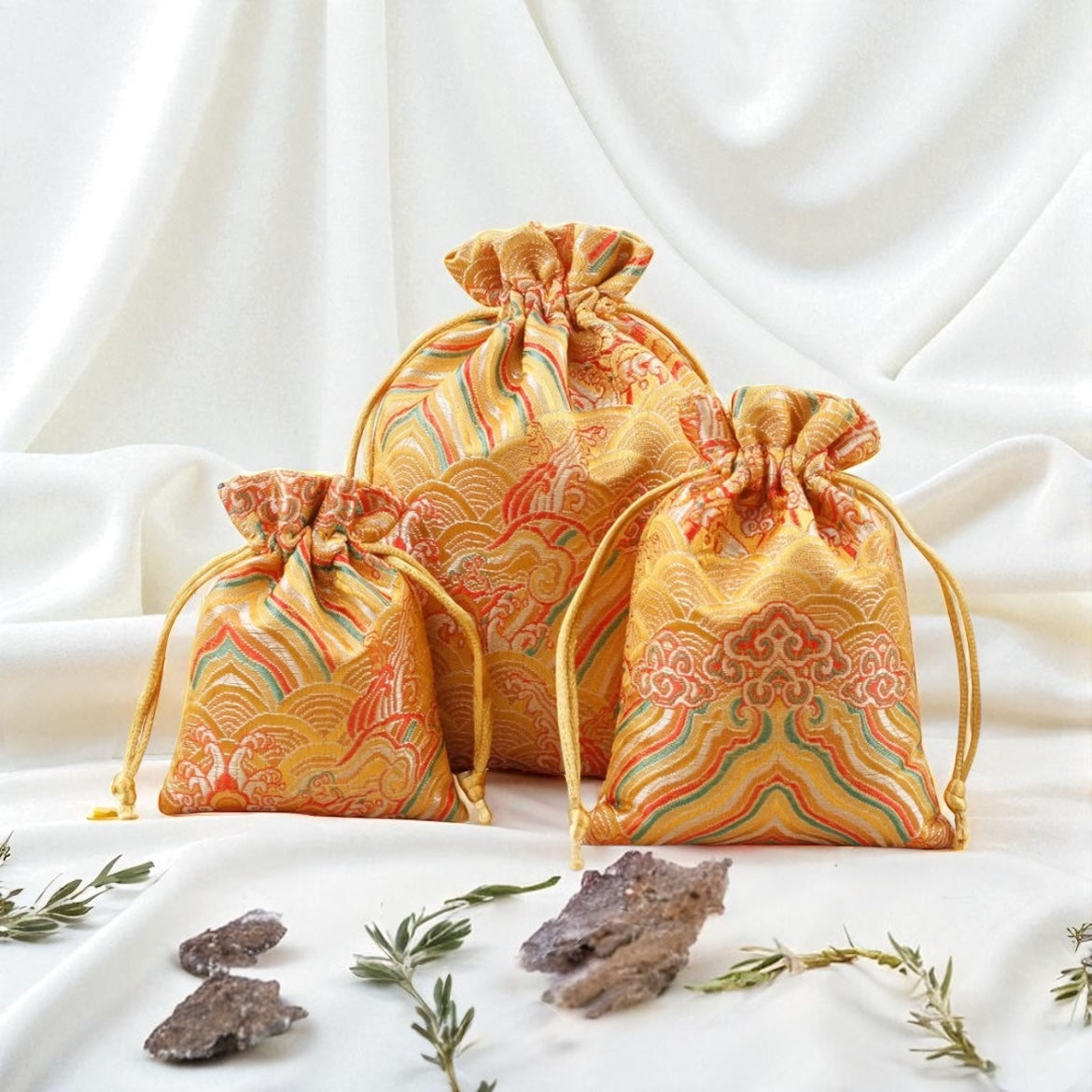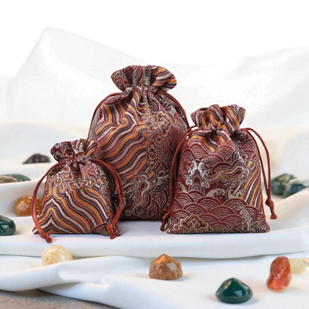 Each pouch is crafted with a drawstring closure and detailed brocade fabric, making them perfect for holding jewelry, crystals, spell ingredients, charms, or gifts.