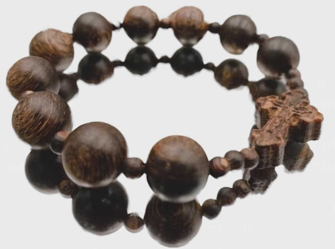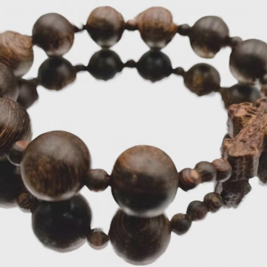 A devotional bracelet made with natural agarwood prayer beads, finished with a fully-carved agarwood crucifix centerpiece. The wood’s natural grain and resin give each piece a deep tone and subtle aroma— no two are the same.