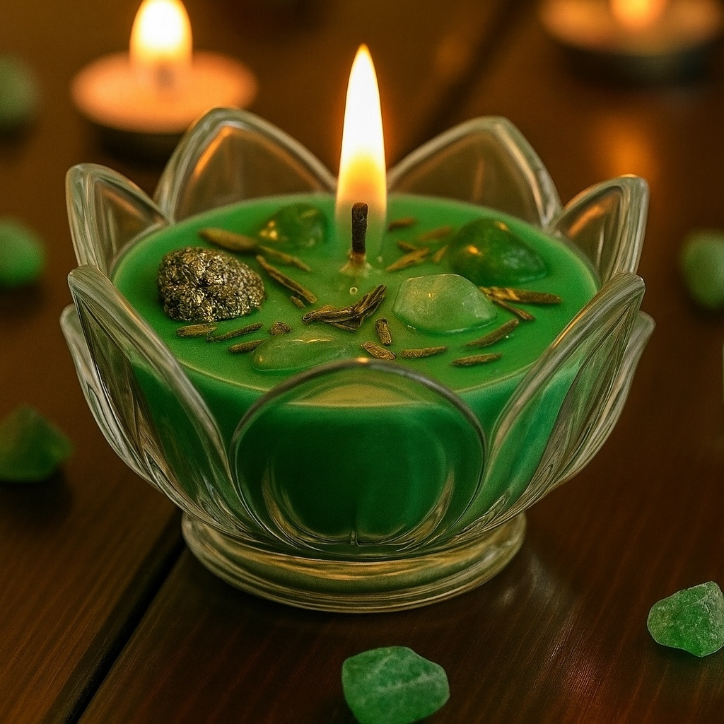 • Wax: Green-dyed soy, hand-poured into a reusable lotus flower glass base