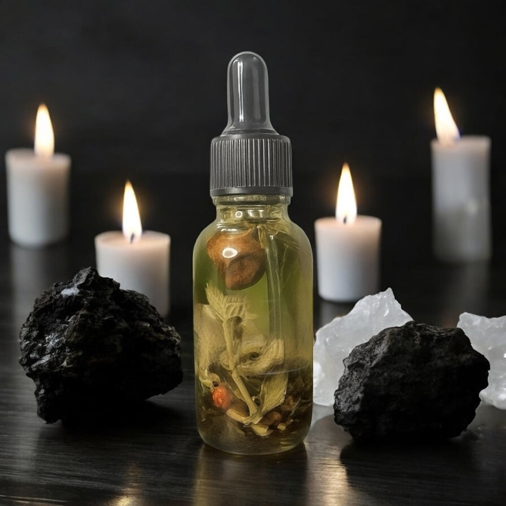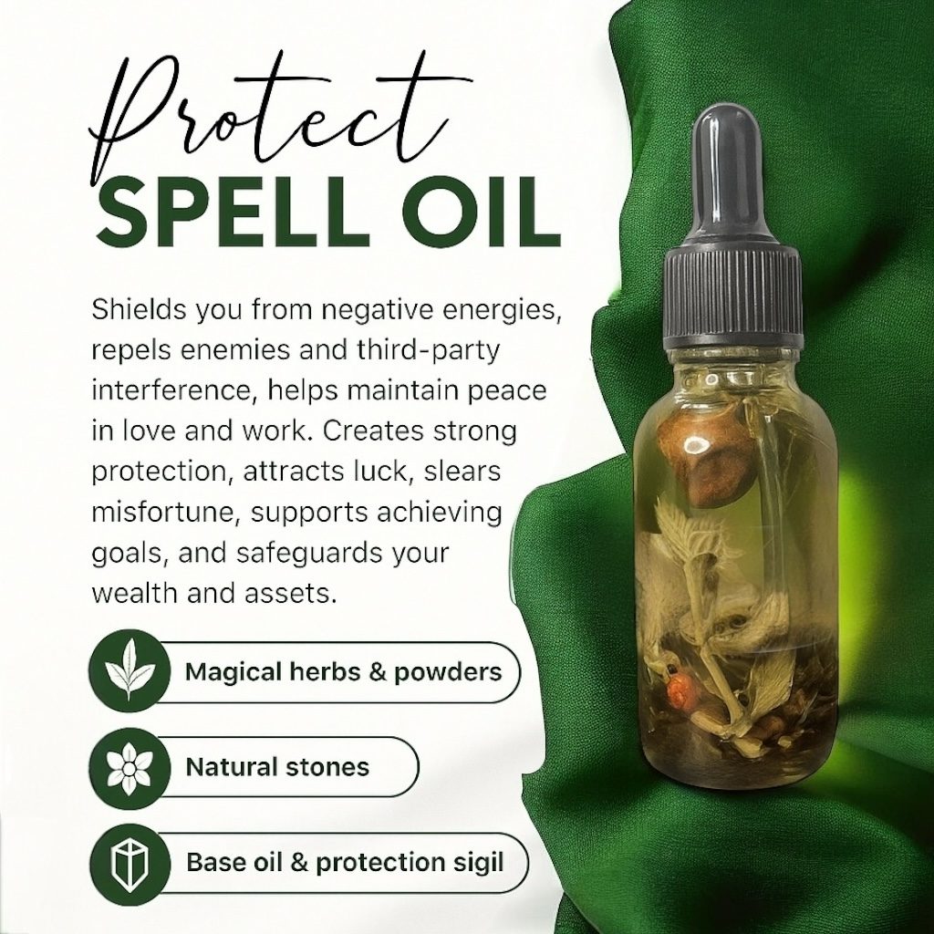 Crafted with magical herbs, natural stones, and a protection sigil, this oil is designed to shield against negative energies, repel envy and harm, clear misfortune, and safeguard your peace, wealth, and well-being. It also helps strengthen your boundaries while supporting success in your goals.